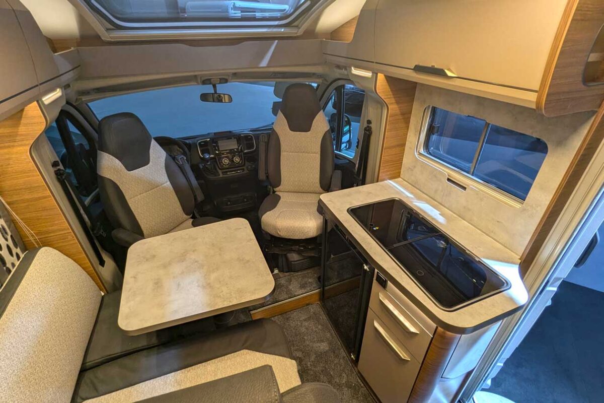 Zur Sitzgruppe gehört neben dem Fahrersitz auch eine L-förmige Sitzbank, die optional den recht großen, quadratischen Teleskop-Einsäulen-Tisch umgrenzt. Mit einem leichten Umbau lassen sich aus dem Ensemble zwei Sitzplätze mit Drei-Punkt-Gurt gewinnen. Dennoch ist der Grundriss im Knaus Van TI 550 MF in erster Linie auf zwei Personen ausgerichtet. Das betrifft insbesondere die Schlafplätze.