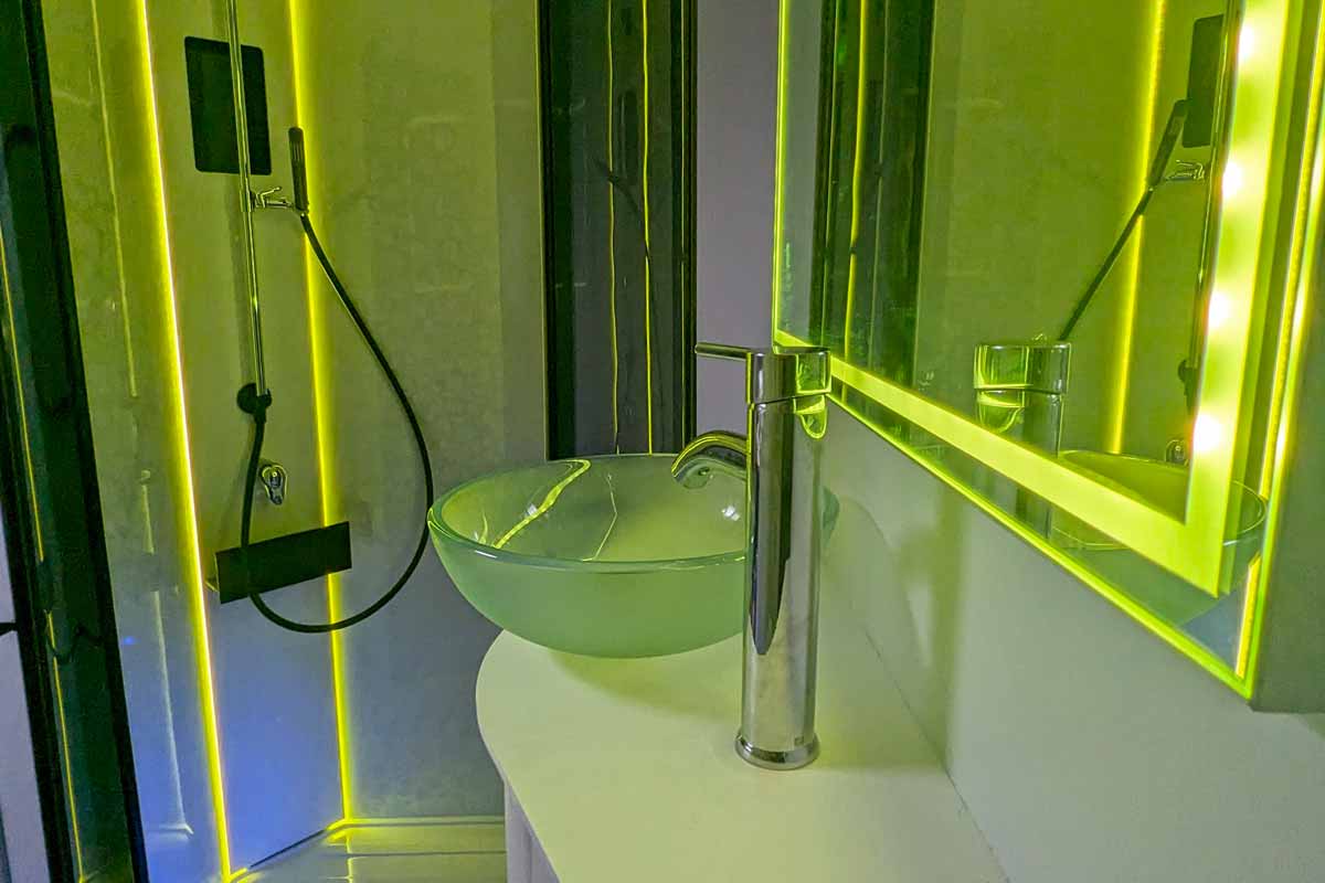 Im Bad selbst gibt es dann auf der einen Seite eine Duschkabine – ihr gegenüber das WC. Für zusätzliche Atmosphäre sorgt eine bunte LED-Beleuchtung, die per Fernbedienung variabel eingestellt werden kann. Notin hat hier auf etwa zwei Quadratmetern ein Mini-Spa gezaubert, das für Menschen mit Komfort-Bedürfnissen im Wohnmobil wie gemacht ist.