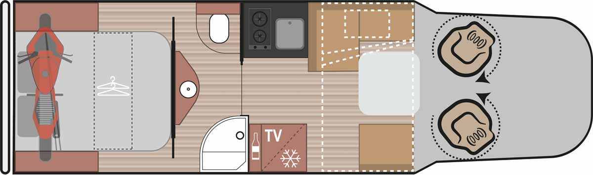 Ein Teilintegrierter mit drei Zimmern – geht das? Ja, im Notin Bilbao sind Wohnbereich, Raumbad und Queensbett auf elegante Weise teilbar.