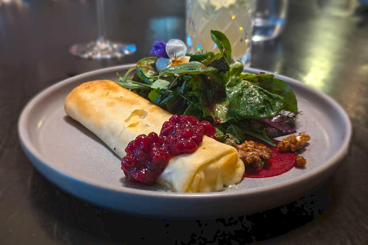Kräuter spielen auch in der Vorspeise eine mitentscheidende Rolle. Als Salat begleiten sie einen Reblochon im Blätterteig-Mantel. Das erlaubt, diesen wirklich typischen Savoie-Käse in ein Menü zu integrieren. Oft gehört er zu einem Fondue. Die Kombination Reblochon – Kräutersalat kombiniert der Koch mit einem Rote-Beete-Carpaccio und kandierten Walnüssen. Resultat ist ein gleichermaßen raues wie liebliches Gericht.