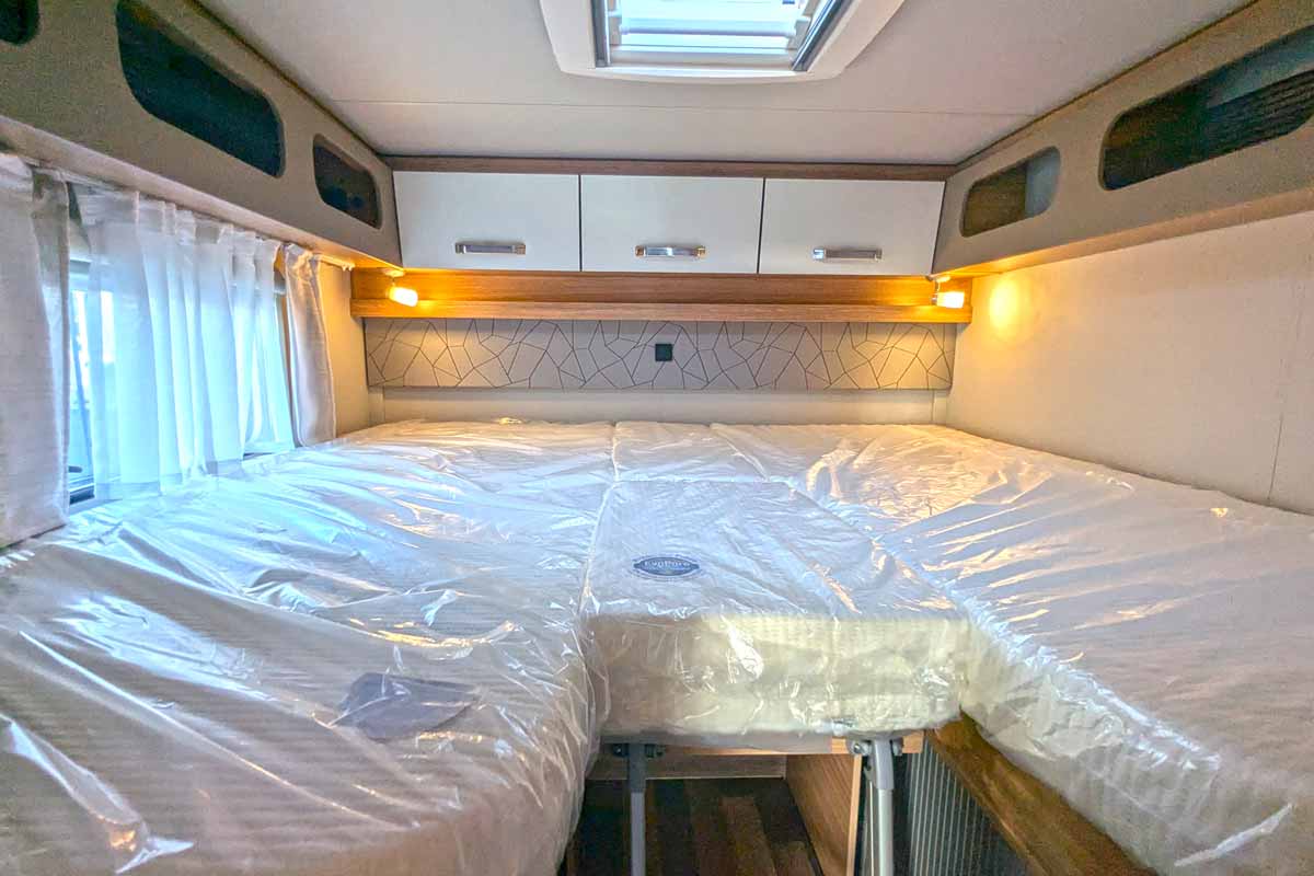 Auch die Bettenmaße sprechen für sich. Beide Einzelbetten im Heck sind zwei Meter lang und 0,8 Meter breit. So bekommen alle erholsamen Platz zum Schlafen. Die Option für eine geschlossene Liegefläche gibt es ebenfalls. Ein zusätzliches Stück Matratze sorgt für ein 2,05 Meter breites Kuschelareal.