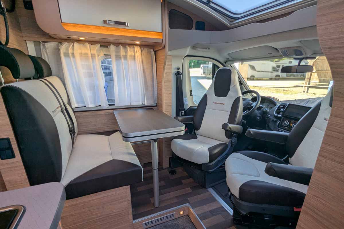 Zu den Stärken des Weinsberg Pepper zählt seine Innenausstattung. Holztöne und orangefarbenes Licht schaffen eine markenbildende und warme Atmosphäre. In Kombination mit den grauen Glattflächen und den durchgängig im Wohndesign gestalteten Polstern bietet sich ein solides Ambiente.